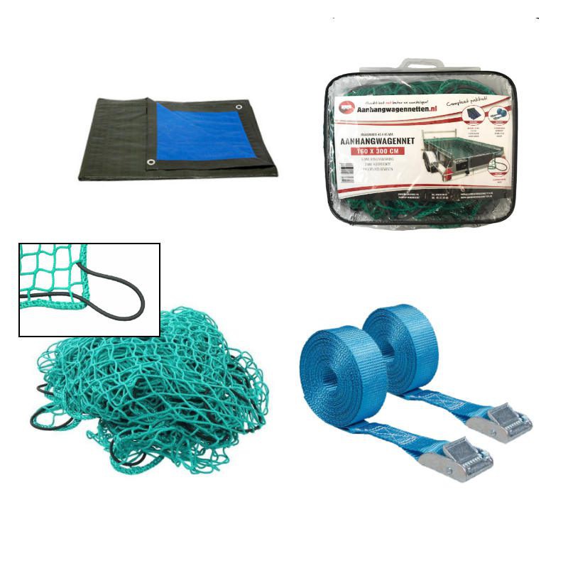 Aanhangerset 45mm met een aanhangwagennet 160x300cm – 8mm elastisch koord – 2 spanbanden – 2x3m afdekzeil. Deze 5-delige aanhangerset is de ideale combinatie voor aanhangers van ong. B 120-130cm x L 245-255cm.